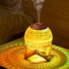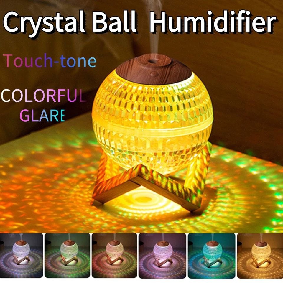 L'humidificateur présente un sommet sphérique joliment arrondi qui ressemble à une boule de cristal. Fabriqué à partir de matériaux cristallins de haute qualité avec un motif facetté, il réfracte la lumière pour créer des effets scintillants fascinants. La base est en bois naturel, offrant stabilité et une touche organique qui complète n'importe quel décor.