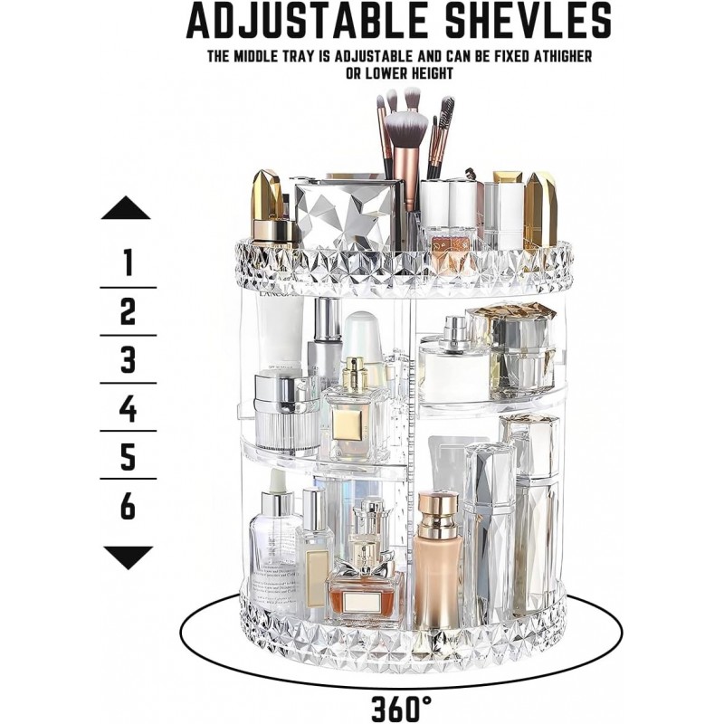 Découvrez l'Organisateur de beauté rotatif à 360 degrés, 3 niveaux de rangement pour maquillage avec support rotatif pour cosmétiques, idéal. Ce rangement élégant maximise votre espace tout en offrant un accès facile à vos produits de beauté. Fabriqué en acrylique transparent et conçu pour s'adapter à tous les styles, il est parfait pour toute salle de bain ou coiffeuse.