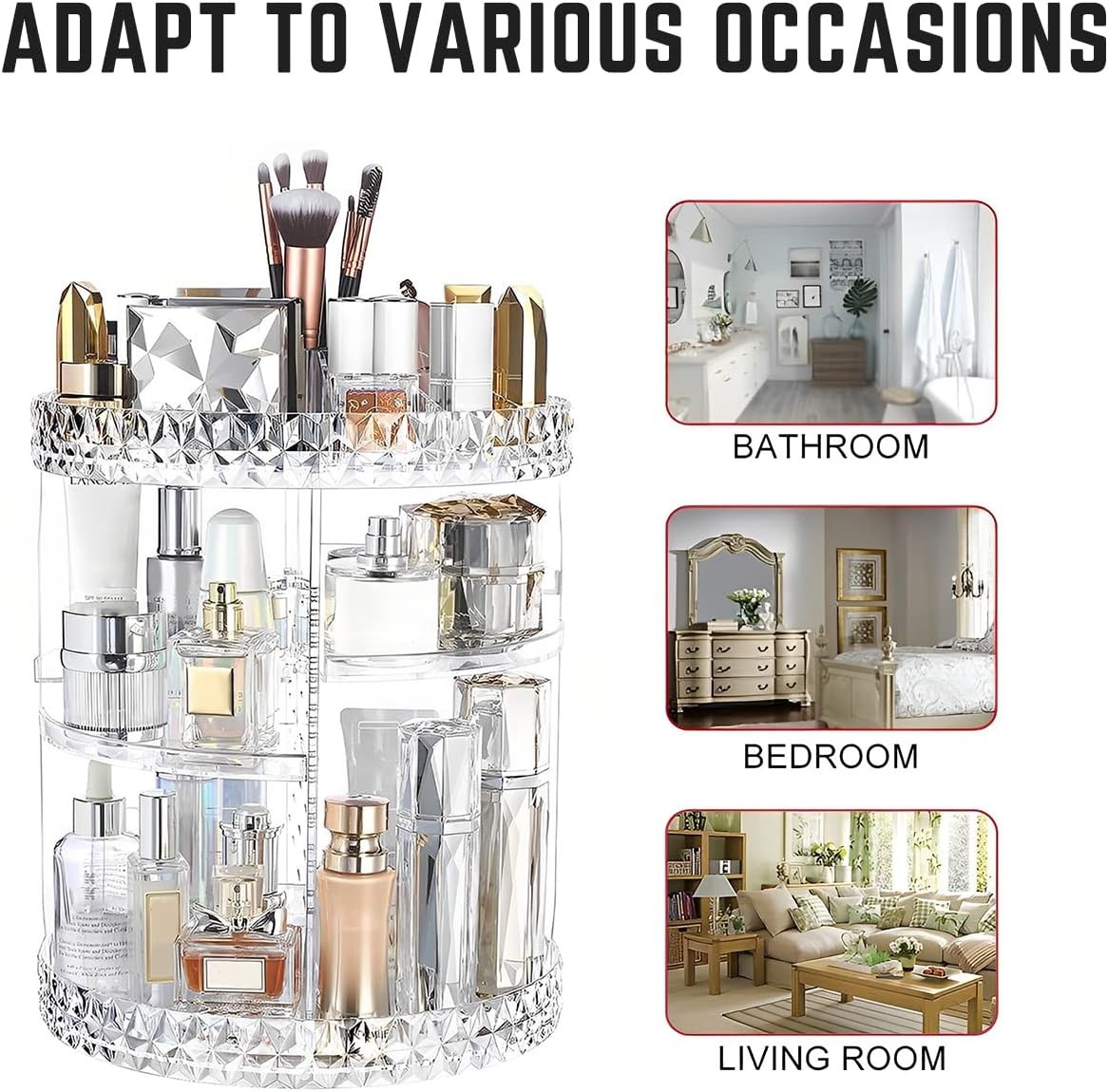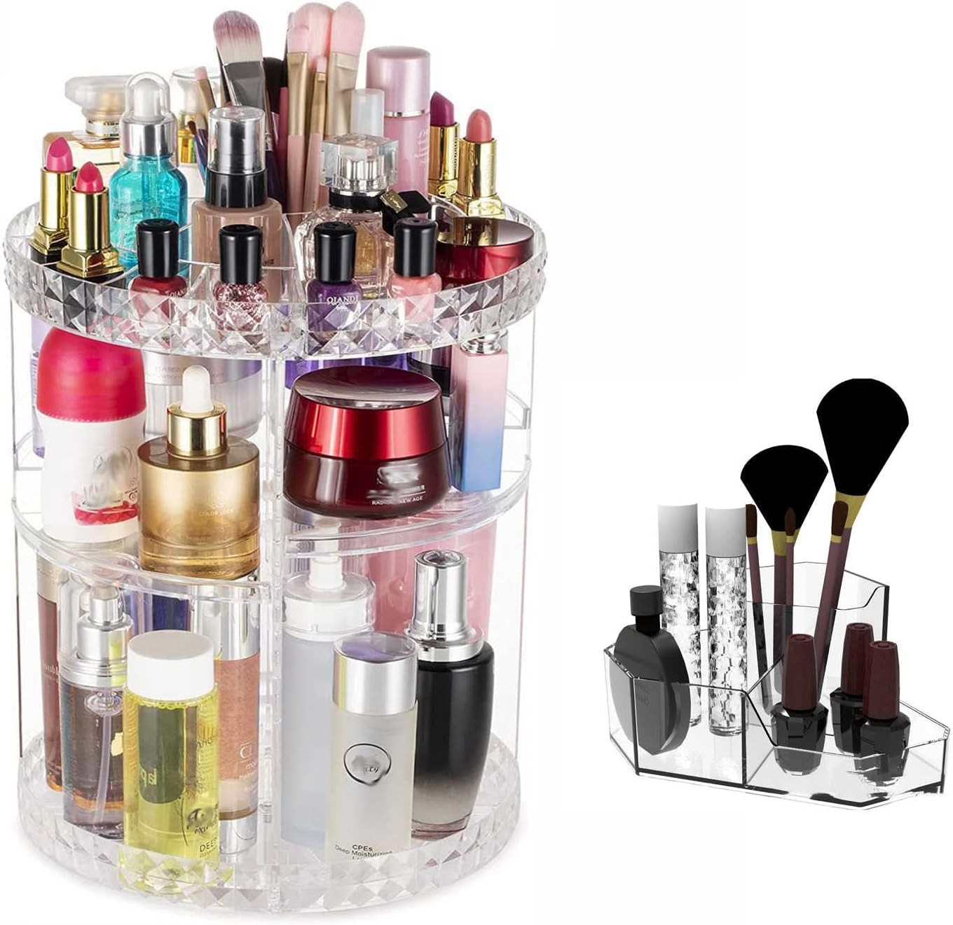L'Organisateur de beauté rotatif peut contenir jusqu'à 80 % des produits que vous utilisez quotidiennement : parfums, rouges à lèvres, vernis à ongles et bien plus encore. Chaque niveau est conçu pour accueillir différents types d'articles cosmétiques afin que tout soit parfaitement organisé et facilement accessible.