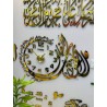 Fabriquées à partir de matériaux de haute qualité, nos horloges murales présentent une finition luxueuse en or et gris, garantissant qu'elles se démarquent comme des pièces maîtresses sur vos murs. La calligraphie arabe complexe sert non seulement d'élément artistique mais porte également une profonde signification spirituelle, améliorant l'ambiance de toute pièce.