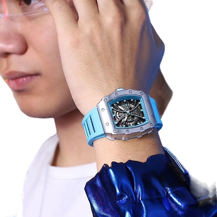 Le cadran de la montre est un véritable chef-d'œuvre, présentant un dégagement squeletté qui révèle les mécanismes internes fascinants. Les marqueurs d'heure circulaires, probablement luminescents, garantissent une visibilité optimale même dans des conditions de faible luminosité. Les aiguilles argentées pour les heures et les minutes sont complétées par une aiguille rouge distinctive pour les secondes, ajoutant une note dynamique au design global.