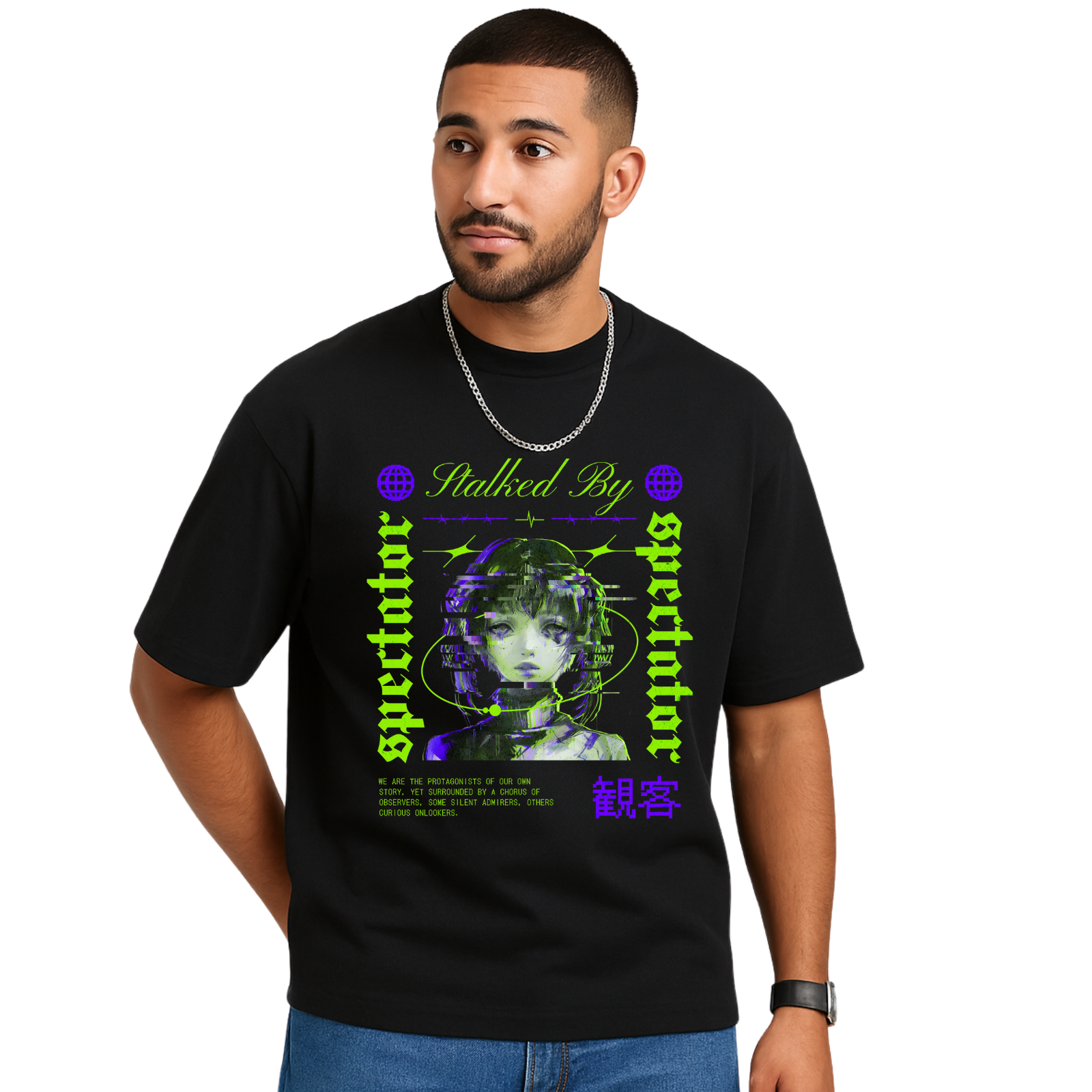 Une caractéristique remarquable de ce t-shirt est son graphique central, qui présente un portrait abstrait avec un effet de glitch moderne. Cette représentation artistique attire non seulement l'attention mais reflète également les tendances artistiques contemporaines. La phrase "Stalked By" orne audacieusement le haut du t-shirt, tandis que des arrangements verticaux de "spectator" flanquent de chaque côté de l'image principale. En bas se trouve un message intrigant : "NOUS SOMMES LES POSTAGERS DE NOS PROPRES DISPOSITIFS, CERTAINS SONT DISTRAITS PAR DES FORMES DE RÉSISTANCE, D'AUTRES NE PEUVENT PAS NOUS VOIR," ajoutant de la profondeur à votre choix de garde-robe.