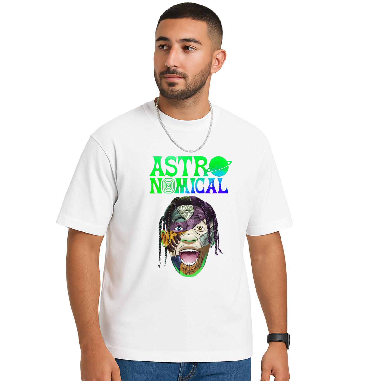 Découvrez notre t-shirt pour homme à manches courtes vibrant, présentant un magnifique design graphique multicolore. Fabriqué en coton respirant, ce t-shirt à coupe décontractée arbore un col rond classique et un texte ludique "ASTRO-NOMICAL". Parfait pour des sorties décontractées ou des festivals de musique, il allie confort et style avec aisance, en faisant un ajout essentiel à toute garde-robe tendance.