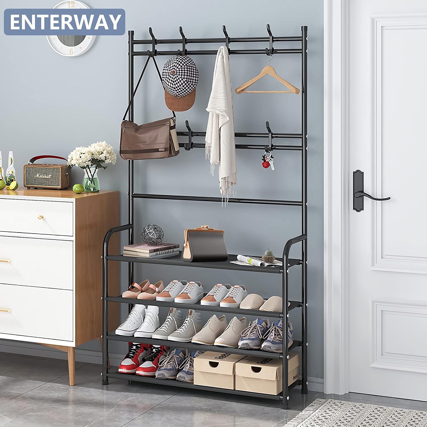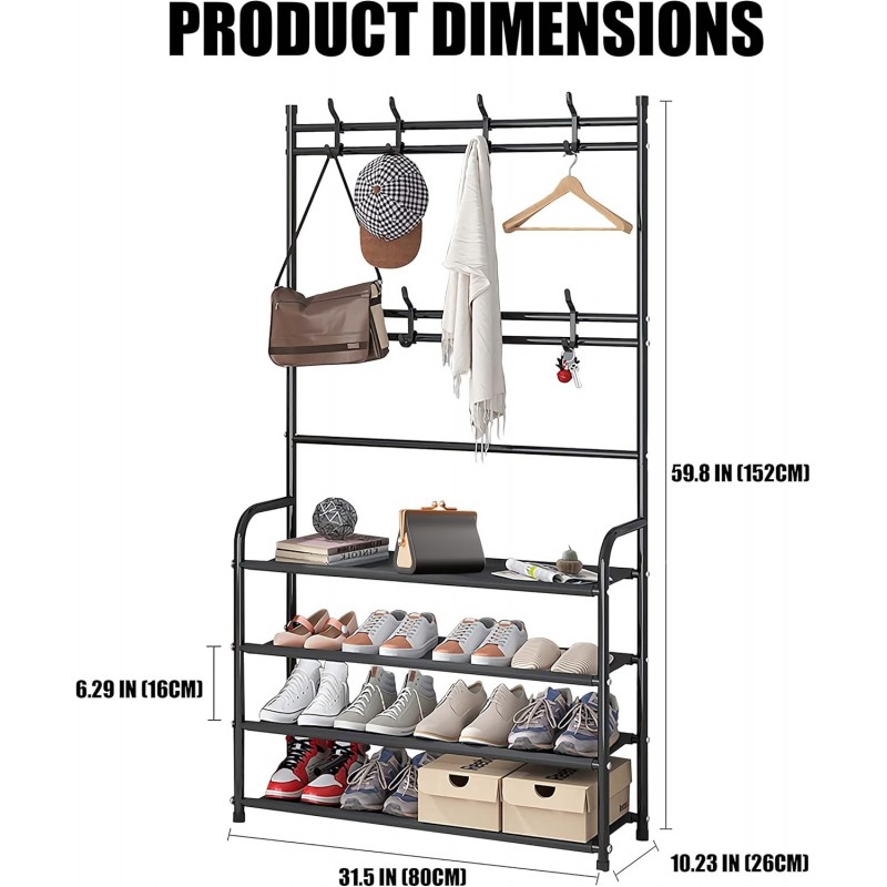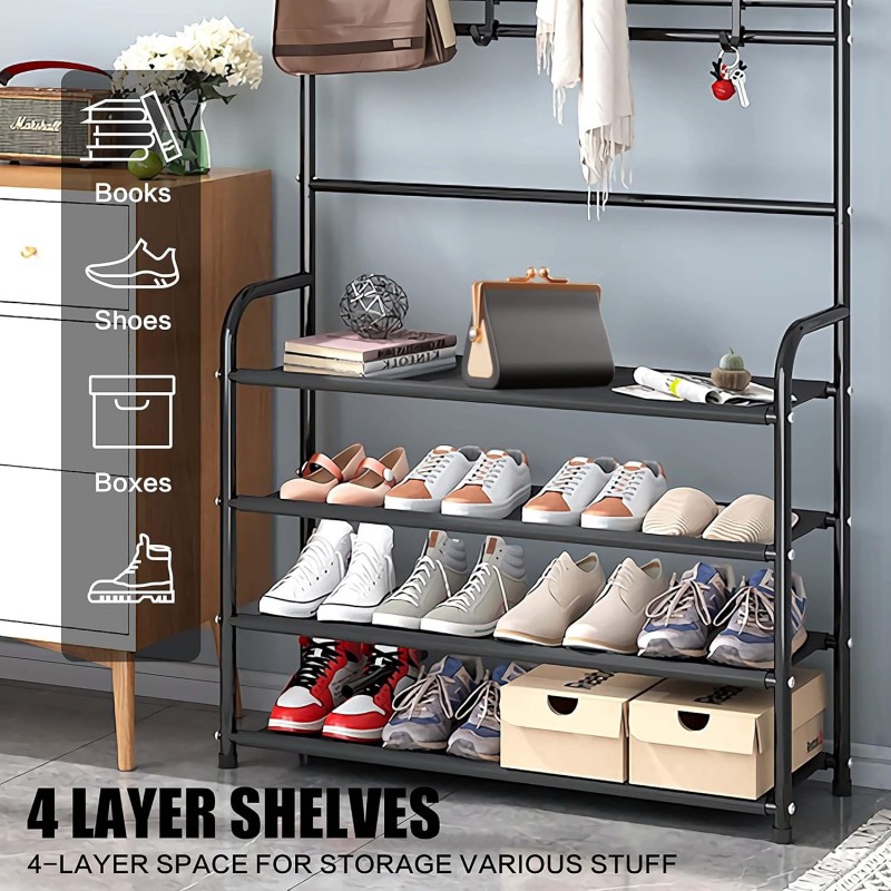Le porte-manteau est équipé de 8 crochets doubles, vous permettant d'accrocher plusieurs articles tels que des manteaux, des chapeaux, des écharpes et des sacs sans craindre qu'ils ne glissent. Chaque crochet est soigneusement conçu avec une courbe vers le haut pour plus de sécurité. De plus, les étagères de rangement à 4 niveaux offrent des options polyvalentes pour organiser des chaussures ou afficher des objets décoratifs, ce qui en fait un choix idéal pour tout foyer.