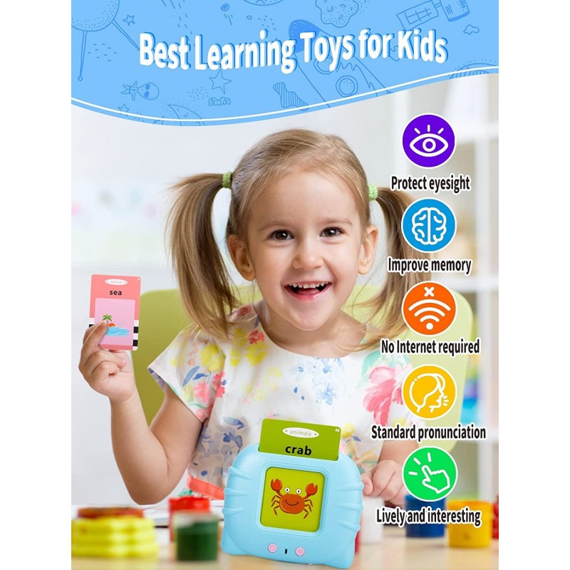 Fabriquées en ABS, ces cartes sont inodores et dotées d'une surface lisse qui garantit la sécurité des enfants. Le dispositif compact présente une couleur bleue douce qui attire l'attention des petits tout en leur offrant une expérience tactile agréable. Grâce à son écran intégré, les enfants peuvent visualiser des illustrations colorées correspondant aux mots sur chaque carte.
