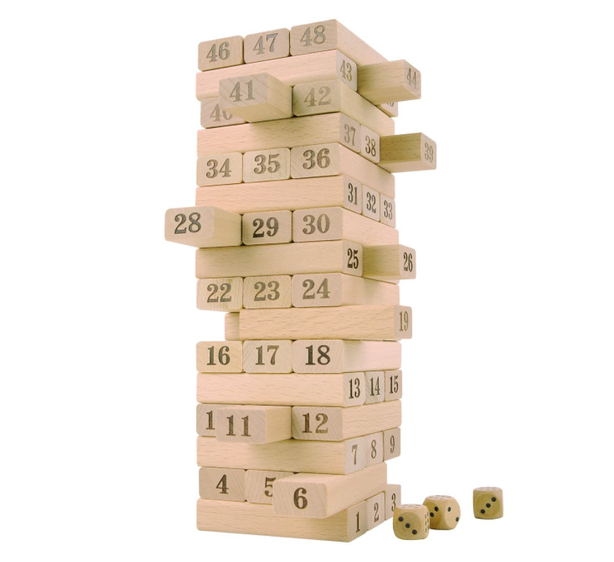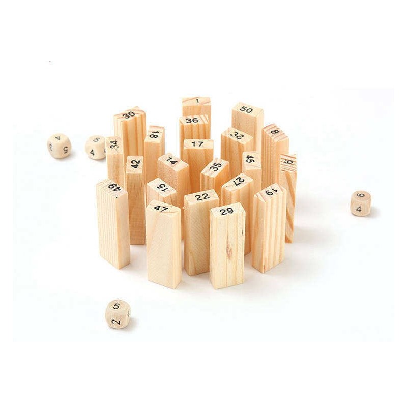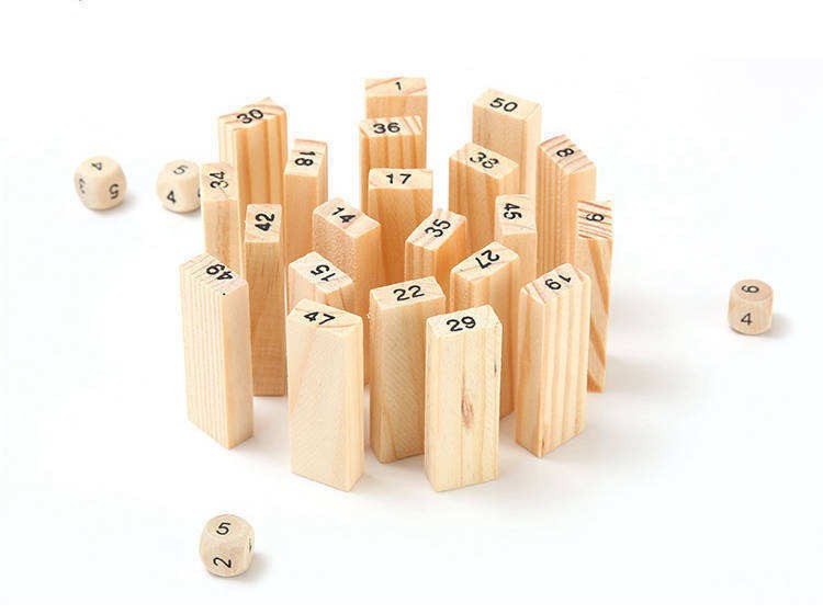 Pour pimenter vos parties, trois dés en bois sont inclus pour déterminer quel bloc retirer lors du tour. L'objectif est simple : retirer un bloc sans faire tomber la tour ! Ce gameplay encourage non seulement la réflexion stratégique, mais développe également la coordination œil-main et les compétences motrices fines.