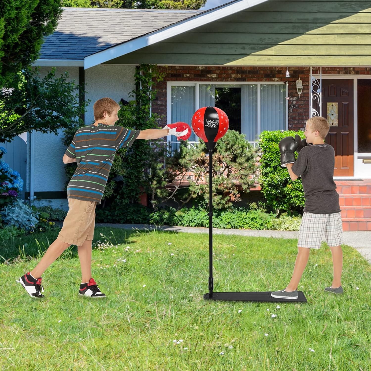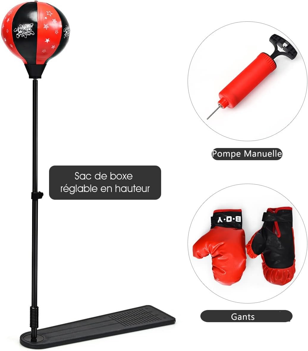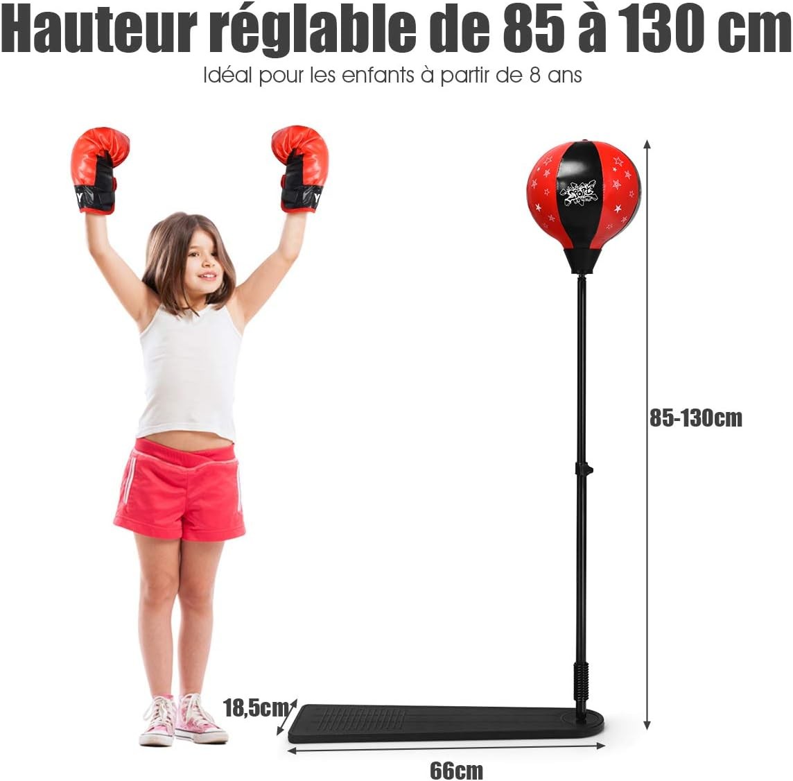 Découvrez le GYMAX Punching Ball pour Enfants 85-130cm, un sac de frappe réglable qui s'adapte à la croissance de votre enfant. Inclus avec des gants de boxe et une pompe à main, cet équipement favorise l'activité physique tout en développant coordination et réflexes. Sa conception colorée et sécurisée rend chaque séance d'entraînement amusante et engageante.